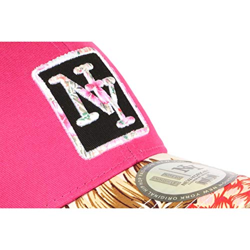 Acquista berretto NY rete rosa e bianco design di fiori tropicali fashion e top rosa modello Hawaii Candy presentato da Hip Hop Honour, cappello trucker donna e uomo colorato e di tendenza, visiera baseball in tela motivi caraibi, adesivo New York Original, misura regolabile.