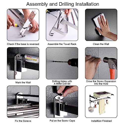 4, Installazione semplice: foratura a parete. Facile da montare, semplice ma pratico. Viti incluse. Pulisci semplicemente il portasciugamani pieghevole con un panno di cotone morbido per rimuovere polvere e umidità quotidiane.