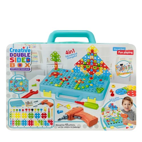 【DIVERTENTE DA GIOCARE】 Con il trapano, i bambini possono avvitare e svitare le viti ABS e le schede a mosaico nei fori della scatola per creare vari modelli interessanti, per ottenere lo sviluppo STEM con l'ingegneria di base. Grande sviluppo motorio fine, cognitivo del colore, capacità di lavoro di squadra, abilità artistica cognitiva, sensoriale, cognitiva, abilità pratica, immaginazione e creatività.