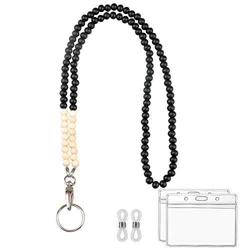 HONZUEN Perline di legno cordino lungo, Laccio da Collo Cordino con Porta Carte e Anello Per Occhiali, per ID Carta di Identità, Porta Badge, Chiavi, Occhiali (Nero Bianco)