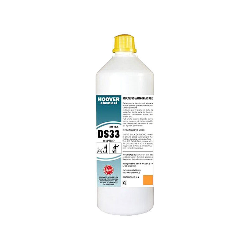Detergente liquido ad elevata azione pulente gradevolmente profumato al limone. Indicato per l'igiene di tutte le superfici della sala da bagno: lavandini, rubinetterie, docce, piastrelle, etc. Puo' anche essere utilizzato per le pulizie generali di cucine plastificate, ceramiche, pavimenti di tutti i tipi e pareti piastrellate. DS33 Rapido e' confezionato in flacone di plastica da 1 Lt. CAMPI DI APPLICAZIONE DS33 Rapido e' particolarmente indicato per la pulizia delle sale da bagno (servizi igienici, sanitari, ceramica) e delle cucine (lavelli, rubinetterie, piani di lavoro, pavimenti e pareti). MODALITÀ DI IMPIEGO - Igiene sale da bagno: versare alcune gocce sulla spugna inumidita e passare sulla superficie. - Pulizie generali: diluire all'1-2% (100-200 ml. in 10 lt. di acqua) e applicare a mano o a macchina. CARATTERISTICHE TECNICHE - Composizione: tensioattivi non ionici, saponi idrosolubili, - Aspetto fisico: liquido opaco azzurro leggermente viscoso - Odore: limone - Peso