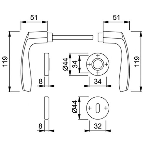 Confezione: 2 maniglie, 2 rosette, 2 bocchette con foro ovale, 1 perno 8 mm e viti montaggio