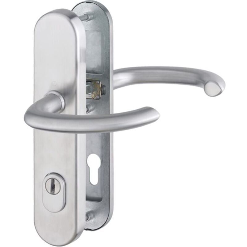 Accessori di protezione, Marsiglia E86G/3332ZA/331010/1138Z HOPPE hardware di protezione in acciaio inox SHR. 1 (SK2): testato secondo a4 18257, sottostruttura in acciaio all'esterno e scudo interno. Esterno: pulsante riTagliato, fisso (rimontabile), coperchio cilindro di acciaio temprato per cilindro sporgente lunghezza 10 - 18 mm. interno: maniglia del portello del lotto, collegamento rapido del perno del Hoppe (con il perno pieno HOPPE-FDW, penna staccata con la variante 10 millimetri), ad alta resistenza, Avvitamento nascosto. Lo spessore dei segni interni è stato modificato da 8mm a 10mm....