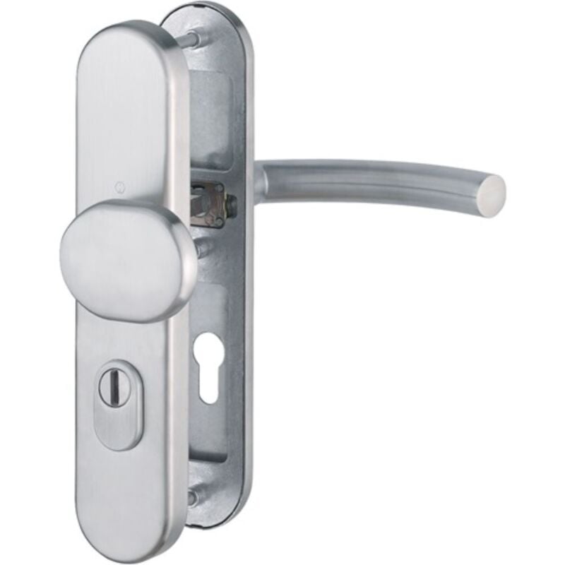 Fissaggi di protezione, serie Trondheim E86G/3332ZA/3310/1430Z HOPPE hardware di protezione in acciaio inox SHR. 1 (SK2): testato secondo a4 18257, sottostruttura in acciaio nella schermatura esterna e interna. Esterno: pulsante riTagliato, fisso (rimontabile), coperchio cilindro di acciaio temprato per cilindro sporgente lunghezza 10 - 18 mm. interno: maniglia del portello del lotto, collegamento rapido del perno del Hoppe (con il perno pieno HOPPE-FDW, penna staccata con la variante 10 millimetri), ad alta resistenza, Avvitamento nascosto. Lo spessore dei segni interni è stato modificato da 8mm a 10mm. Con la molla di ritorno destra-/Links può essere usato.