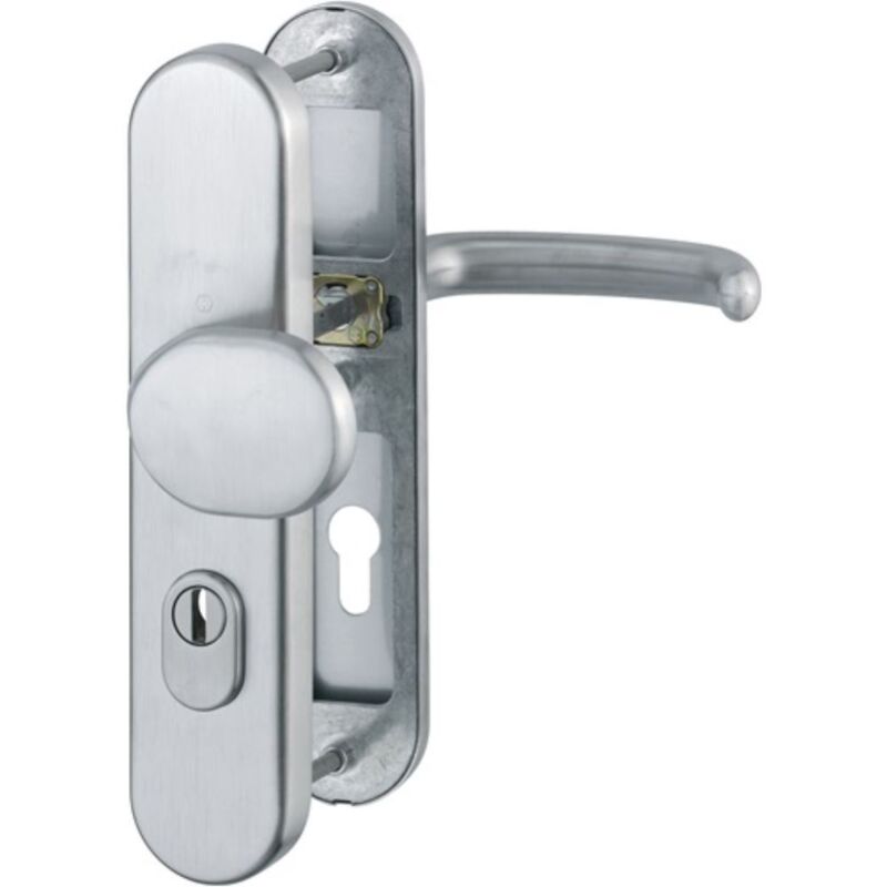 Per la chiusura delle porte · Sottostruttura in acciaio attorno all'esterno e sottostruttura Zamak nello scudo interno · esterno: bottone appuntato e fisso · con molla di ritorno · interno: maniglia della porta allentata · Connessione a pin rapido (con penna completa Hoppe FDW) · Coperchio cilindro in acciaio temprato per la lunghezza del cilindro sporgente 10 - 18 mm · avvitamento nascosto e continuo · Perforazione PZ · DIN sinistra / destra · Classe di resistenza ES 1 Altre caratteristiche tecniche: · Larghezza: 54mm · Lunghezza: 250mm · Copertina: con coperchio del cilindro · Spessore dello scudo: 15 mm · Colore n.: F69
