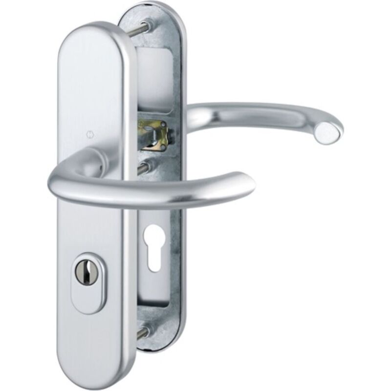 Set di scudi lunghi protettivo in alluminio con coperchio del cilindro per porte di chiusura esterne / appartamenti · testato secondo DIN EN 1906: 37-0142A (SK2), certificato secondo DIN 18257 ES1, set di oggetti (categoria d'uso 3) · Deposito: maniglie delle porte allentate (set intercambiabile: pulsante appuntato all'esterno, può essere riassemblato), molla di ritorno a destra/sinistra utilizzabile, cuscinetto semplice senza manutenzione · Connessione: perno rapido HOPPE con perno completo HOPPE (grilletto, parte pin/foro) / perno completo HOPPE-FDW (tsl intercambiabile, parte foro) · Coperchio cilindro: acciaio temprato, per lunghezza cilindro sporgente 10-18 mm · Sottostruttura: acciaio esterno, zamak all'interno, camma di supporto · Fissaggio: visibile all'interno, viti continue filettate Classe di resistenza M6 ES 1 Altre caratteristiche tecniche: · Larghezza: 54mm · Lunghezza: 250mm · Copertina: con coperchio del cilindro · Spessore dello scudo: 15 mm · Colore n.: F1