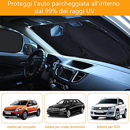 Ampia Compatibilità:Dimensioni: 160*86cm, Parasole per parabrezza adatta per la maggior parte delle auto sul mercato. Prima di ordinare, si prega gentilmente misurare il parabrezza dell'auto. inclusi SUV, Camion, Vans e auto.