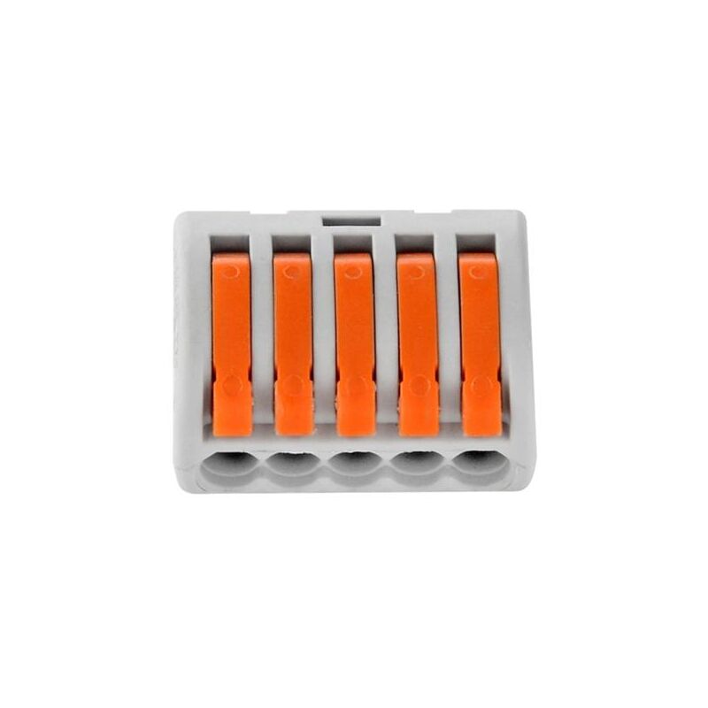 Senza utilizzare un cacciavite) ... grazie al sistema di serraggio della molla, basta sollevare la leva, inserire il filo adeguato e abbassare la leva per ottenere una connessione sicura. Questo terminale di connessione a 5 fili con leva ha un marcatore di lunghezza per lo stripping del filo, che si trova sulla parte inferiore del terminale. Il diametro dei fili elettrici può variare da 0,08 mm a 4 mm. prodotto in conformità con standard questo e direttiva ROHS . venduto da un set di 5 unità