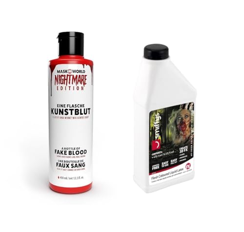 Horror Schmink Set di bottiglie per trucco XXL - sangue artificiale e latte in lattice (470 ml) per grandi effetti horror e decorazione per Halloween