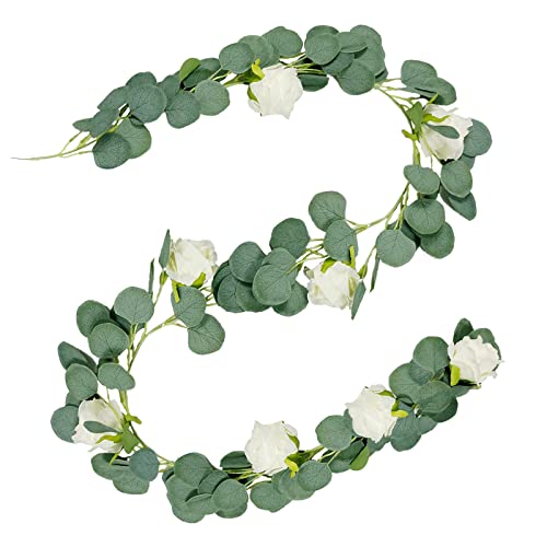 HOSAUNA Ghirlanda di foglie di eucalipto artificiale con rose piante artificiali ghirlanda di foglie di eucalipto piante artificiali per decorazione da parete giardino matrimonio festa (2 metri)