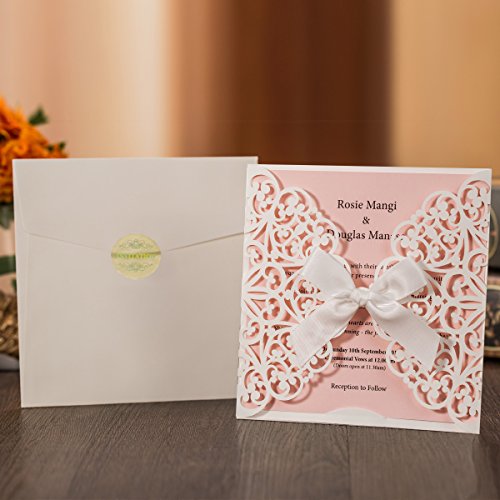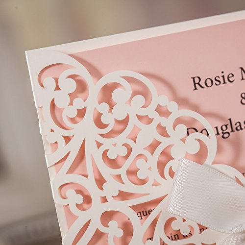 HOSMSUA 20pcs inviti Matrimonio Laser Taglio Wedding Invitations Cards Bianco e Rosa con Fiocco in Pizzo Manica per Bambino Nuziale Doccia Compleanno Fidanzamento Quinceanera (Confezione da 20 Pezzi)