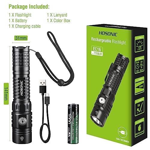 HOSONIC EC16 Torcia LED Ricaricabile USB, 1750 Lumens Torcia LED Alta Potente Professionale, 7 Modalità Torcia Tattica Militare, IP68 Impermeabile Mini Flashlight per Campeggio Trekking