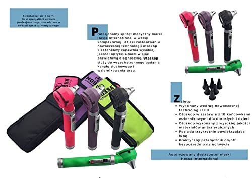 HOSSA INT- OTOSCOPE con luce, ingrandimento 3x, 10 speculum tips dimensioni, strumento diagnostico con custodia in plastica rigida, set piccolo otoscopio per infermiere, bambini, adulti (verde)