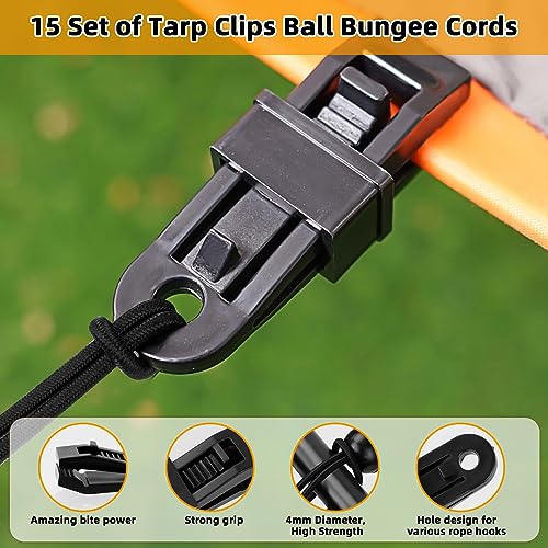 Hossom 15 Clip per Teloni Telo Campeggio con 15 Corde Elastiche a Sfera per Tende, Tarp Clips per Tenda di Fissaggio Regolabile Morsetti Campeggio Antivento per Telo Barca Piscina Esterno Campeggio