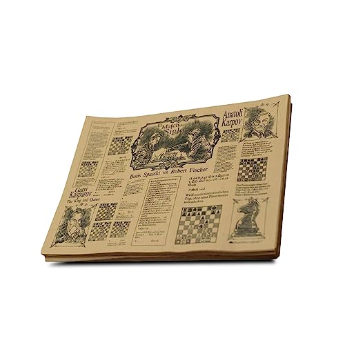 Design originale: queste tovagliette di carta che simulano un giornale hanno un design unico e originale basato sulle leggende della storia degli scacchi con uno sfondo di carta kraft marrone. Inoltre, in questi sottopentola individuali puoi vedere la "Match del secolo", una grande partita di scacchi tra Stati Uniti e Russia nella guerra fredda.