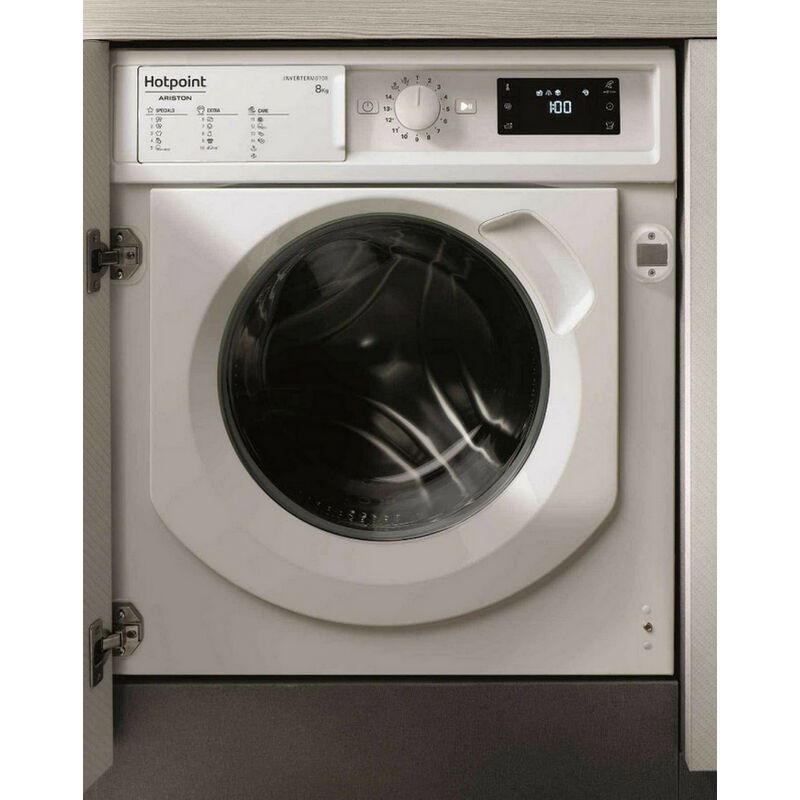 Questa lavatrice da incasso Hotpoint BIWMHG81484EU rimuove più di 100 macchie in un solo lavaggio senza pretrattamento! Anti-Stain 100: Elimina le macchie più ostinate senza pretrattamento! Questo ciclo di lavaggio rimuove più di 100 macchie a soli 40° in un unico lavaggio senza pretrattamento. Dotato di un motore a induzione robusto, durevole e silenzioso. Tipo di prodotto: lavatrice da incasso. Capacità nominale per il programma cotone standard a 60°C o 40°C a pieno carico (kg): 8. Classe energetica: A+++. contro di energia annua ponderata (AE C) in kWh/anno: 138. contro programma cotone standard energia a 60°C a pieno carico (kWh): 0,73. contro programma cotone standard energia a 60°C a metà carico (kWh): 0,505. contro energia del programma standard ''cotone'' a 40°C a metà carico (kWh): 0,505. contro modalità di spegnimento a energia ponderata (W): 0,5. contro modalità sinistra-on ponderata in base all'energia (W): 8. contro di acqua annua ponderata (AW C) in L/anno: 11.900.