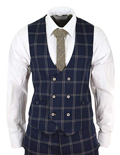 House Of Cavani Abito Uomo 3 Pezzi Principe di Galles a Scacchi con Gilet a Doppio Petto Vintage - Marineblau 52UK, 62IT Giacca - 46" Pantaloni