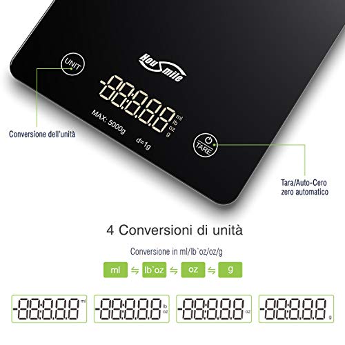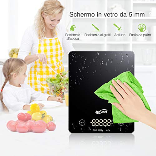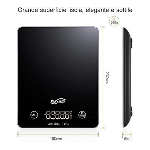HOUSMILE Bilancia Cucina Digitale da Vetro Temperato ad Alta precisione Misurazione 3g - 5kg, Dotato di Funzione Tara, Bilancia Multifunzione per Cucina con Display LCD Colore Nero