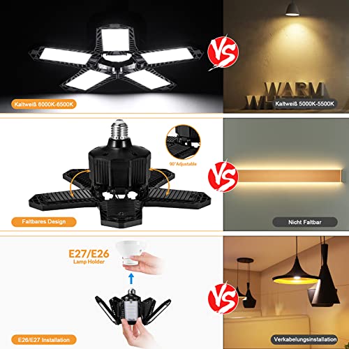 Houssem Lampada da Garage a LED, 80W 8000LM Lampada da Negozio Deformabile con 5 Pannelli Regolabili Plafoniera LED, E26/E27 Plafoniere Garage Luce per Garage Magazzino Officina Palestra Cucina