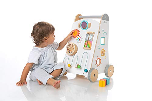 Il carrellino in legno è interamente a forma di un allegro arcobaleno e consente di giocarci da ogni lato. I dettagli in legno variopinti a forma di luna, nuvola, stella, ecc. stimolano la vista dei più piccoli e allenano la capacità di riconoscere i contrasti.