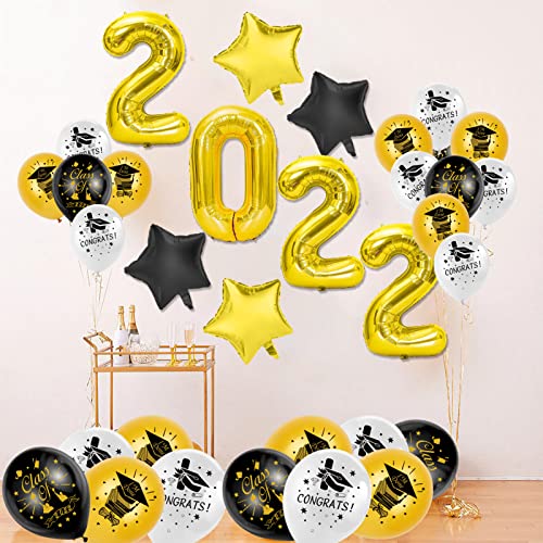 【Decorazione di laurea】 Questo pacchetto di accessori per feste 2022 nero e oro viene fornito con un grande palloncino oro 2022 da 40 pollici, un pacchetto di 12 palloncini in lattice di laurea, 4 palloncini foil a stella, 4 palloncini coriandoli dorati, 1 pz nastri (10 m / pz). Un must per un college, liceo, forniture per feste di laurea a tema ballo di fine anno.