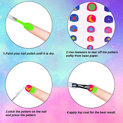 Di Lunga Durata - Queste simpatiche adesivi colorati per nail art tatuaggi adesivi per unghie dureranno per diversi giorni finché il tuo smalto rimane attivo se lo fai con attenzione! Facile da rimuovere utilizzando lo smalto per unghie, goditi il divertimento del fai-da-te per unghie. Un piccolo regalo colorato carino per bomboniere per donne ragazze bambini.