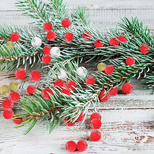 Quantità: 6 confezioni da 240 pezzi di bacche artificiali glassate, tra cui 160 pezzi di rosso, 40 pezzi di argento, 40 pezzi di oro, design satinato, adatto per la decorazione dell'albero di Natale.