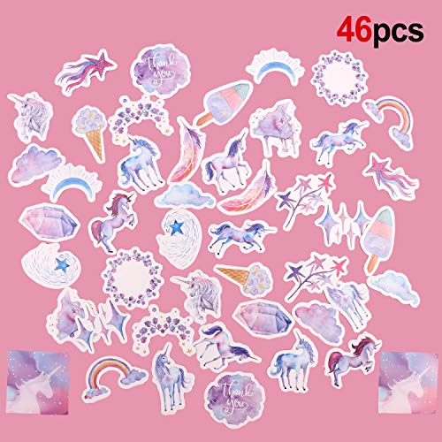 46pcs Adesivi Unicorno Piccoli per Bambini - Il set di adesivi per unicorno è realizzato in adesivo vinilico semilucido privo di acidi. Il suo colore non si attenua facilmente. Gli adesivi graffiti unicorno sono su cartone sottile ma abbastanza robusto da contenere. Basta sbucciare e aderire a qualsiasi superficie liscia e piatta.