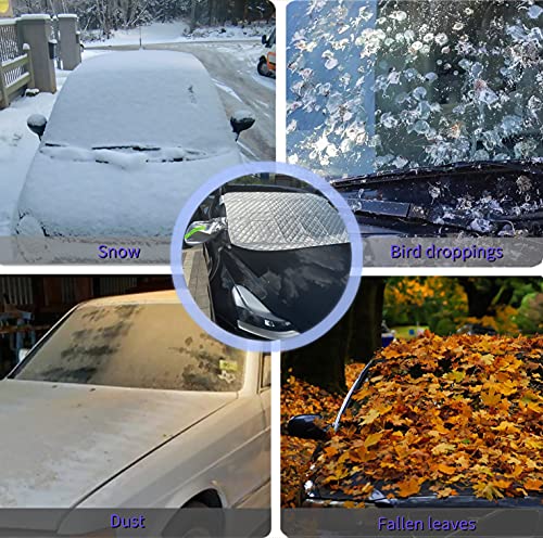 Materiale a 4 strati addensato: questa copertura per parabrezza dell'auto è composta da 4 strati di materiale di alta qualità (foglio di alluminio PEVA, cotone spunlace, fodera in tessuto non tessuto nero, cotone composito), rivestimento in alluminio su entrambi i lati, resistente alla temperatura, impermeabile, resistente al vento, resistente allo strappo. Può mantenere il parabrezza pulito e chiaro, aiuta a bloccare l'area del tergicristallo dell'auto dal riempimento con foglie e aghi di pino