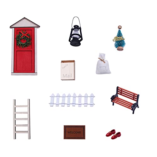 ACCESSORI CASA DELLE BAMBOLE: Riceverai 10/11/12 pezzi mini decorazione della casa delle bambole tra cui porta di legno, albero di Natale, corona di Natale, scopa, tappeto, finestra, stivali, scala, cassetta delle lettere, stampelle e tappeto, ect. Piccolo e leggero, adatto per decorare una casa delle bambole 1:12.
