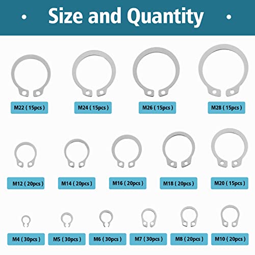 Materiale durevole: kit assortimento di anelli di fissaggio esterni di alta qualità realizzato in acciaio inossidabile 304. Ha una maggiore stenza alla trazione, robustezza e fornisce una maggiore . Gli anelli a scatto sono anelli di fissaggio semi-flessibile, può rimbalzare quando teso.