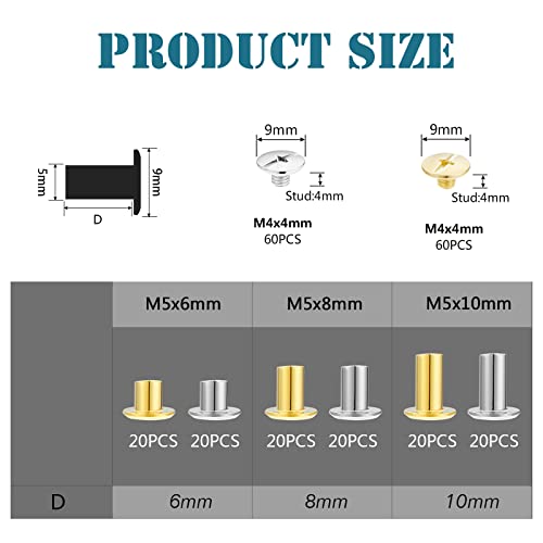 【Viti Chicago assortite】: 2 colori, ogni colore 3 dimensioni, 20 set per ogni dimensione, 120 set di viti chicago in totale.?Diametro del palo è 3 / 16 pollici / 5 mm, 5 tipi di lunghezza del palo sono 6mm, 8mm, 10mm;