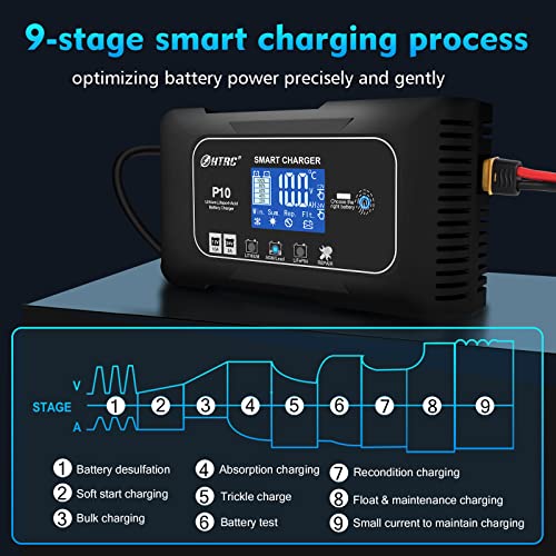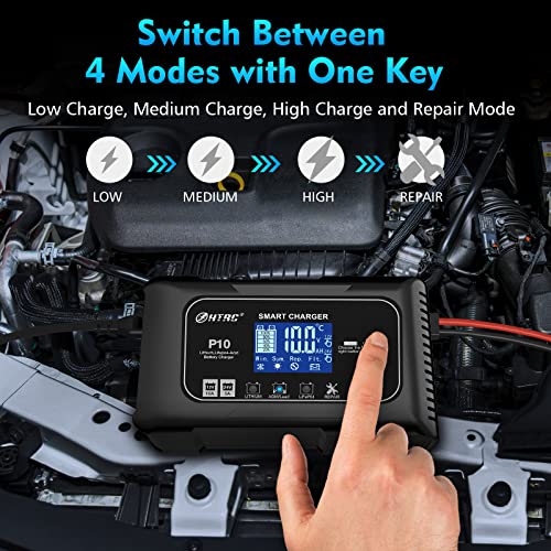 HTRC 10A Carica Batterie per Auto 12V/24V, Mantenitore Batteria Moto con Display LCD e Pulsanti a Sfioramento per Barche SUV/Batterie al Lithium, LiFePo4 e Piombo Acido(AGM, GEL, MF, EFB, SLA, WET)