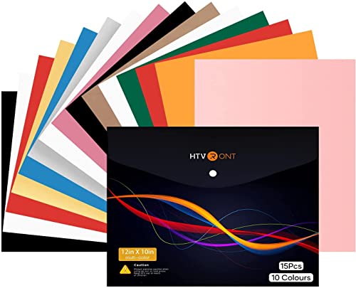 HTVRONT 15 Fogli Vinile Trasferimento Termico, 30.5 x 25.4cm 10 Colori HTV Ferro su Vinile, Termoadesivi Vinile Carta per Fai da Te Magliette Vestiti Cappelli Tessuti, Un foglio di teflon termoadesivo