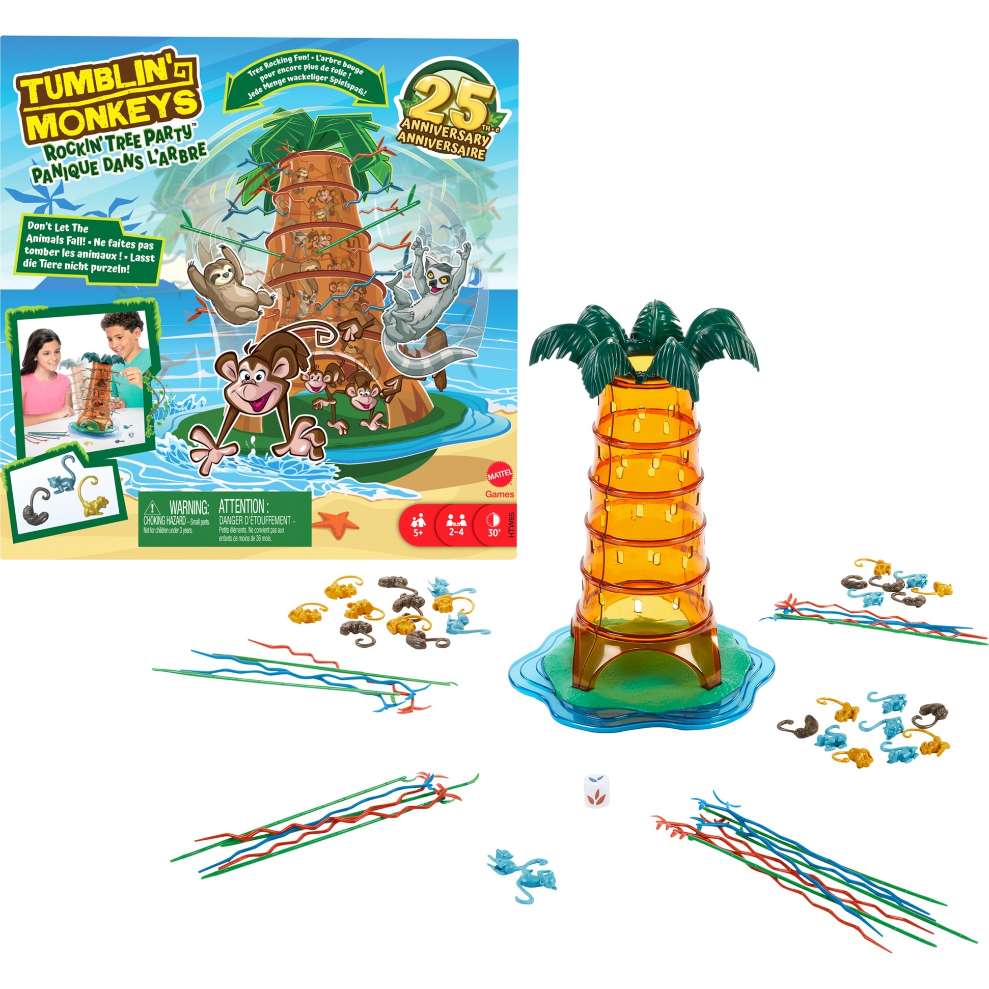 Per il 25° anniversario di "S.O.S. Monkey Alarm" abbiamo questa versione impegnativa del classico di Mattel. Con scimmie dorate, lemuri e bradipi, ci sono tre diverse specie animali appese a una torre di un albero traballante. Le aste che vengono estratte dall''albero ora hanno forme sinuose: questo rende ancora più difficile evitare che gli animali cadano quando i pali vengono estratti. I dadi vengono utilizzati per determinare quale asta deve essere pescata. Il numero di immagini delle mani sul cubo corrisponde al numero di mani sui bastoncini, quindi anche i giocatori daltonici possono identificarle facilmente. Vince chi ha il minor numero di animali alla fine!