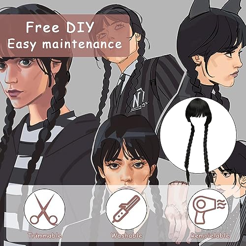 May Huang Parrucca Mercoledi Addams Bambina, Adams Parrucca Intrecciate Nere, Wig Lunga con Frangia, Parrucca Nera Trecce per Cosplay Party Halloween Carnevale