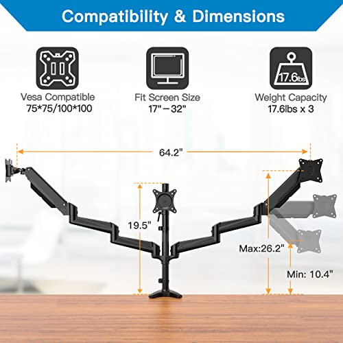 Supporto universale per 3 monitor - Adatto a tre monitor piatto / curvo per computer 17 18 19 20 21 22 23 24 25 26 27 28 29 30 31 32 pollici con fori di montaggio vesa 75 x 75 e 100 x 100, ogni braccio tiene 8 kg. Nota: lo schermo Ultrawide non è supportato!