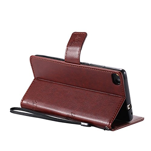 Huawei P8 Custodia,Huawei P8 Custodia in Pelle,Cover Huawei P8,Cozy Hut Cute Case Cover per Huawei P8 con PU Pelle Custodia in Pelle Protettiva Flip Portafoglio Case Cover con Strap / Supporto di Stand / Carte Slot / Chiusura Magnetica (cartoon gatto e albero) - caffè