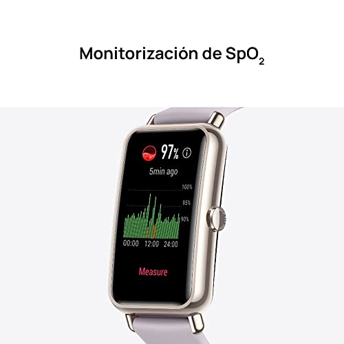 Monitoraggio SpO2 per tutto il giorno: HUAWEI WATCH FIT mini è dotato di un sistema di rilevamento SpO2 integrato che monitora la saturazione di ossigeno nel sangue 24 ore al giorno;