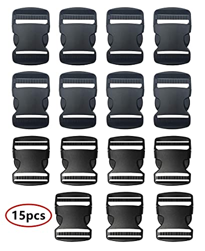 DIMENSIONI E QUANTITÀ: 15 pezzi fibbie a sgancio laterale in una confezione, di colore nero. Ogni fibbia a sgancio laterale piatta misura 2,95 pollici di lunghezza x 1,77 pollici di larghezza/75 mm di lunghezza x 45 mm di larghezza, adatta per cinghie da 1,5 pollici (38 mm).