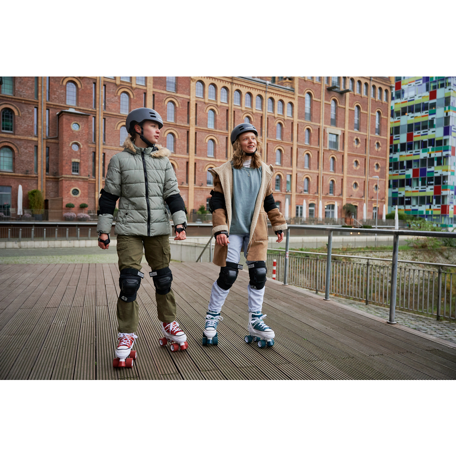 Dettagli del prodotto: Età: da 5 anni Telaio in PP resistente agli urti con alluminio Truck Regolabile in 4 taglie, incluse 4 solette coordinate Polsino in TPE e puntale in nylon Power -trap Fibbia a pressione Ruote in PU fuso, ad alto rimbalzo, cuscinetti a sfera 82A ABEC 3, linguetta comfort in carbonio Dimensioni e peso: Dimensioni dell'imballaggio (lunghezza x larghezza x altezza): 41,5 x 34 x 12 cm. Peso: 3,21 kg Misura della scarpa: 28-31 Dimensione ruota: Ø 60 x 37 mm con peso massimo dell'utente di 60 kg Materiale e cura: Materiale: PP, alluminio, PU Cura: pulire con un panno umido