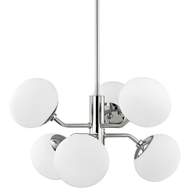 Estee Lampadario 6 Luci Nichel Lucido, Vetro | Finitura: nichel lucido | Materiale: acciaio | Grado di protezione IP: IP20 | Altezza: 38,1 cm | Altezza minima: 62,2 cm | Altezza massima: 184,2 cm | Diametro: 71,1 cm | Tipo di lampada: E27 | N. di lampade: 6 | Lampadina inclusa: no | Dimmerabile: Sì - Sono necessarie lampadine dimmerabili | Peso: 11,34 kg | Potenza (max): 40 W