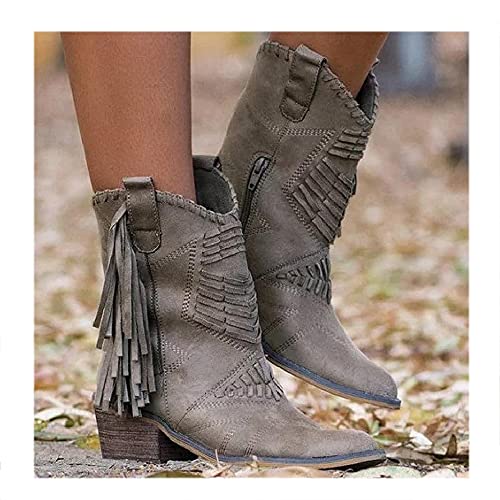 HUDUO Stivali da Cowboy Western Donna Stivali da Cowboy con Frange alla Caviglia Tacco A Blocco Ricamo A metà Polpaccio Scarpe di Moda di Grandi Dimensioni,Grey-42