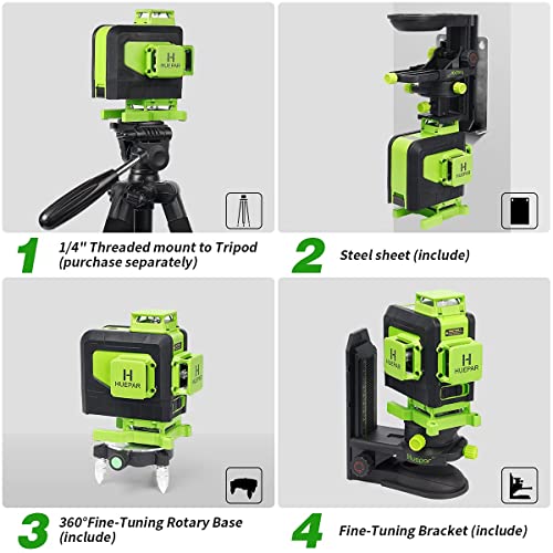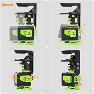 【MICRO-ADJUST BASE & MAGNETIC BRACKET】: The strong magnetic bracket allows for quick positioning to metal surfaces, helping hang the laser level for wall applications. There are four fine adjustment knobs on the bracket, help to adjust the left and right the front and back and the horizontal rotation 360°. The metal micro-adjust base enables users to make 360°adjustment. The laser level also offers 1/4"-20 mount thread to suit a standard tripod or pole mount.