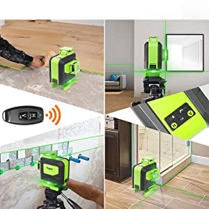 【4 X 360°LASER LINES&REMOTE CONTROL】: This laser tool projects 4D laser lines. The 16 laser lines cross at 90°that can cover the floor, walls and ceiling all around the room. With the remote control, the four 360 laser planes can be selected individually at a distance up to 33Ft.