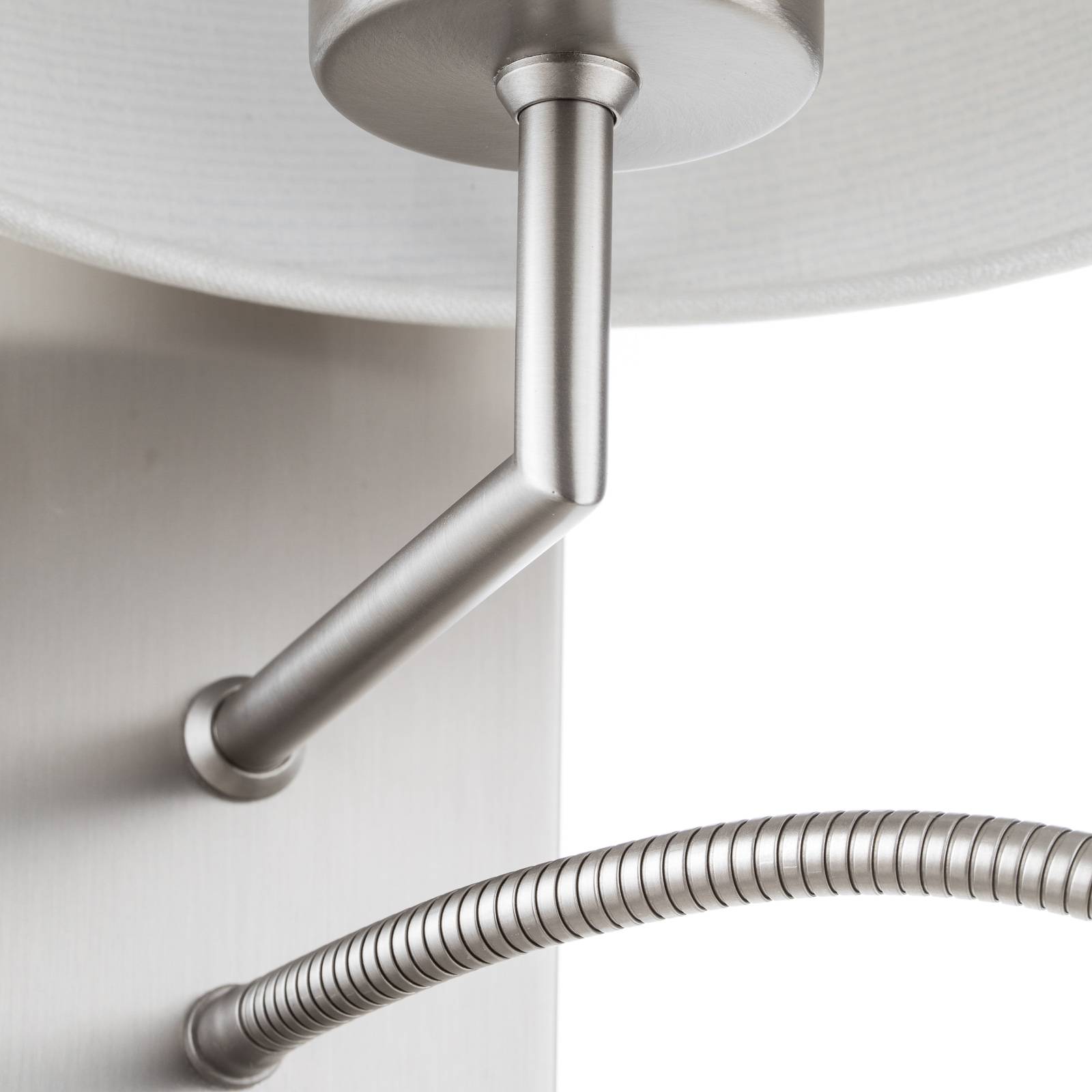 Lampada da parete Havana con braccio di lettura a LED aggiuntivo ed effetto madreperla L'Havana wall light è una lampada da parete dal design classico, che è allo stesso tempo un grande oggetto di illuminazione in soggiorni e camere da letto arredati in stile moderno. Il paralume di forma classica della fonte di luce principale è bianco crema con un effetto madreperla, che rende la superficie molto facile da pulire, perché è lavabile. Inoltre, una luce di lettura a LED può essere accesa da un interruttore nella parte inferiore del supporto a parete, che può essere allineata individualmente grazie al braccio flessibile. La finitura in nichel opaco della staffa conferisce alla lampada da parete un contrasto armonioso al paralume, rendendola elegante. Prodotto in Germania.