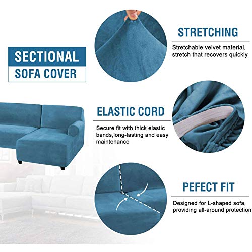 HUNOL Copridivano con Penisola Elasticizzato Velluto, 2 Pezzi Copridivano Angolare Chaise Longue a Forma di L in Velluto per Gatto Cani Bambini-Blu-Destra 2 Posti