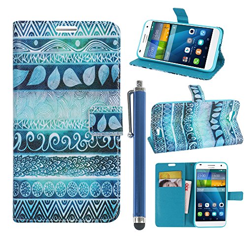 Hunye Custodia PU Pelle Portafoglio per Huawei Ascend G7 Case Indiano Flip Cover con Stilo Penna blu