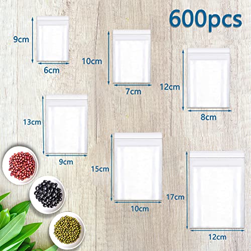 Huruirui 600PCS Sacchetti in Plastica Trasparente Risigillabili, Buste Trasparenti Con Chiusura,6 Diverse Dimensioni del Modello Sacchetti Ziplock Adatto per Confezionare Biscotti Alle Noci 100mµ