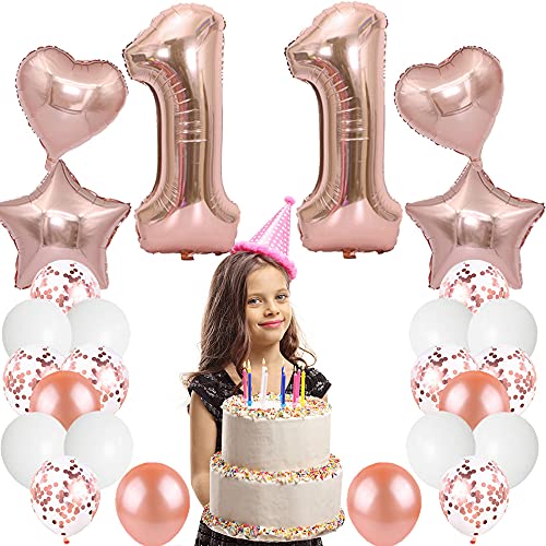 Huture Kit per 11 compleanno per feste in oro rosa con numero 11 palloncino stagnola scritta Happy Birthday decorazione lattice bianco palloncino forma stella forma cuore ottimo regalo per ragazze